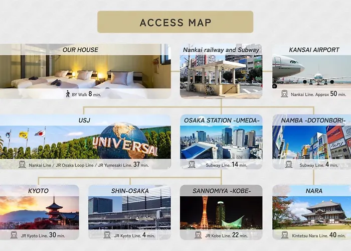 Het is 15 minuten rijden van Kasteel Osaka en 10 minuten rijden naar Spa World. Het centrum van Osaka is op 5 km afstand. Een breed scala aan restaurants is beschikbaar op 5 minuten lopen.